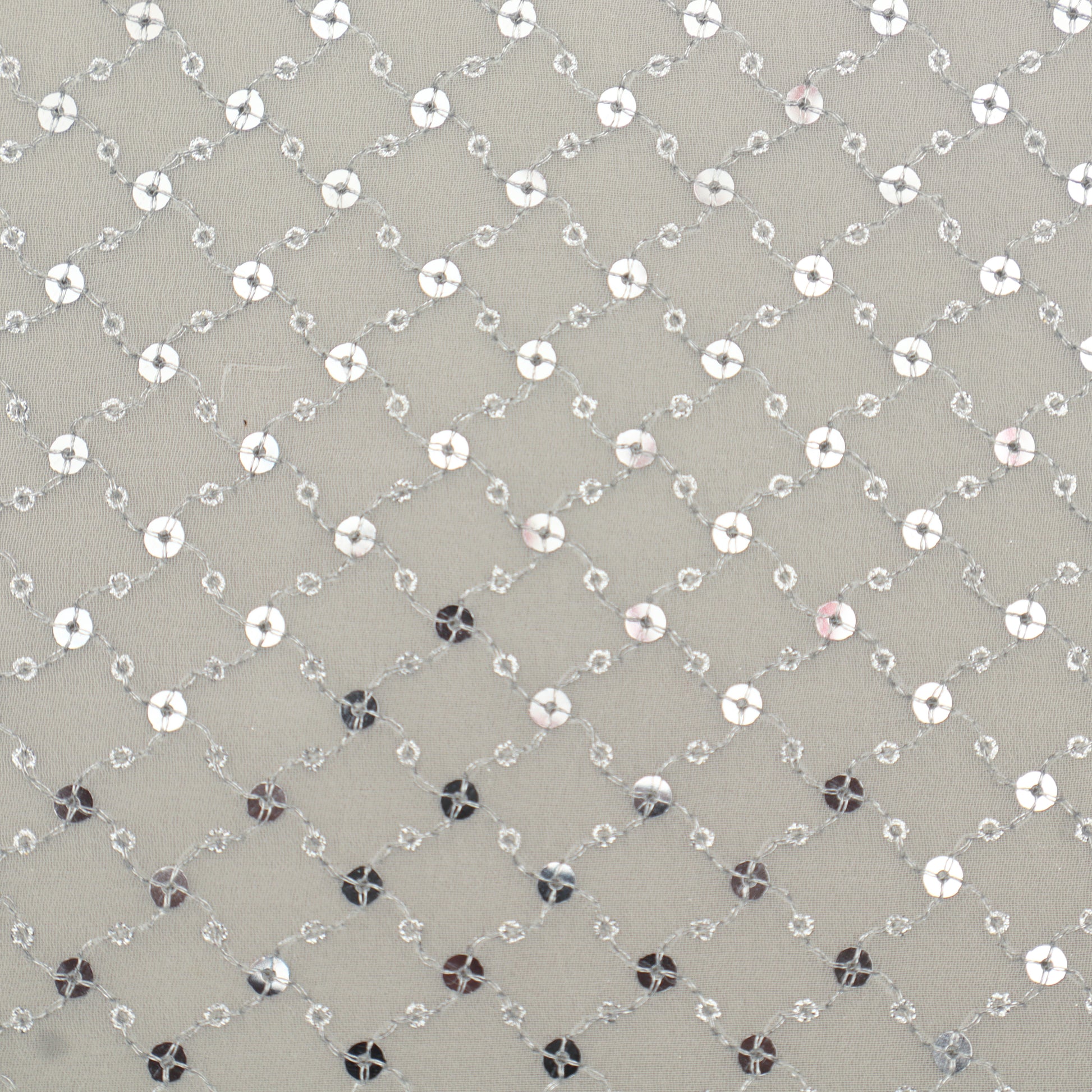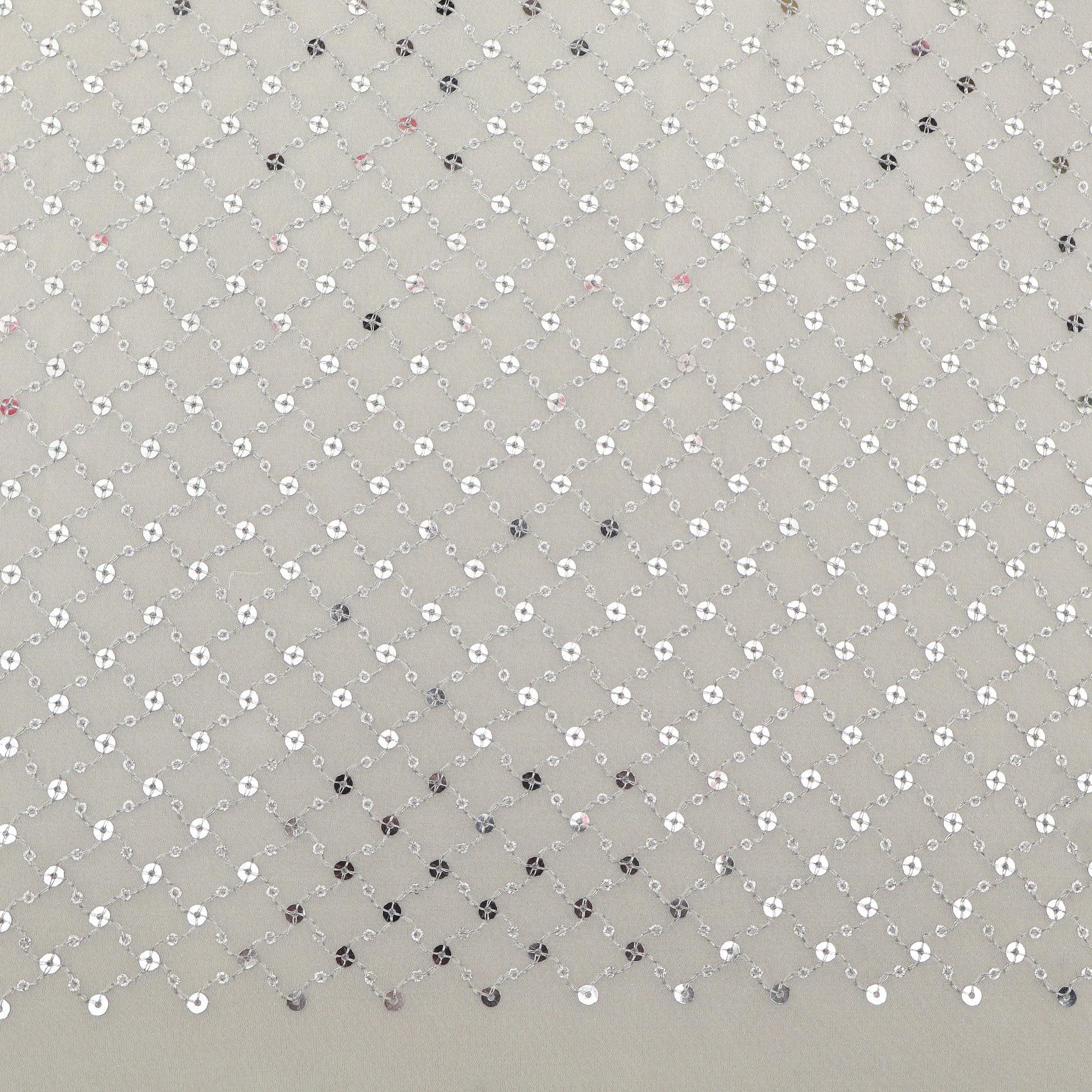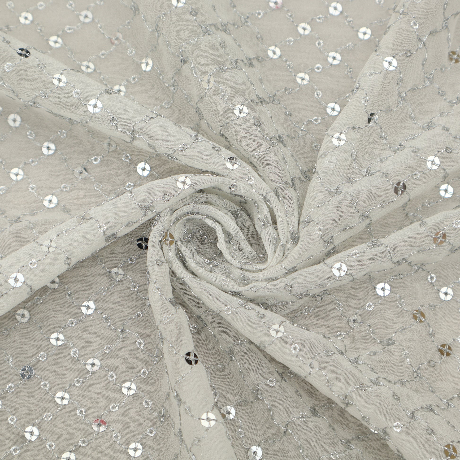 Expertly crafted with delicate white sequins, this georgette embroidery fabric adds a touch of elegance and glamour to any project. The high-quality material is perfect for creating stunning and unique designs. Elevate your sewing and crafting projects with this beautiful fabric.