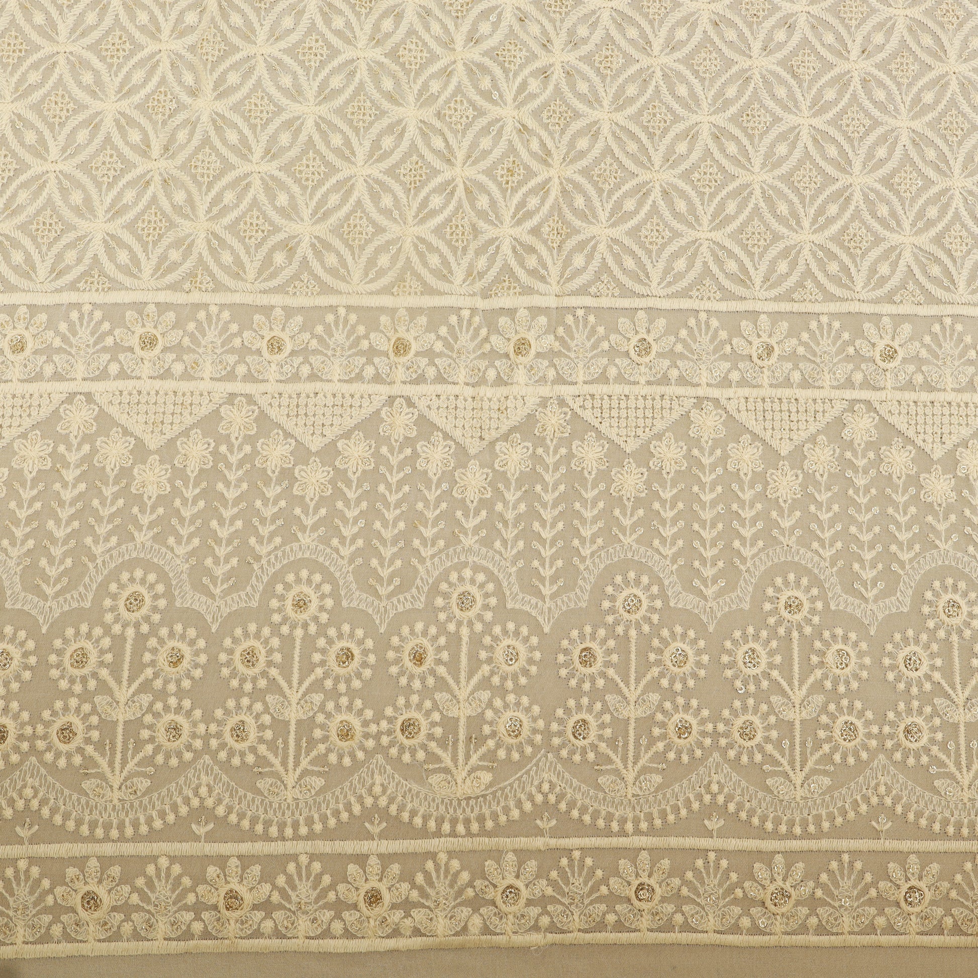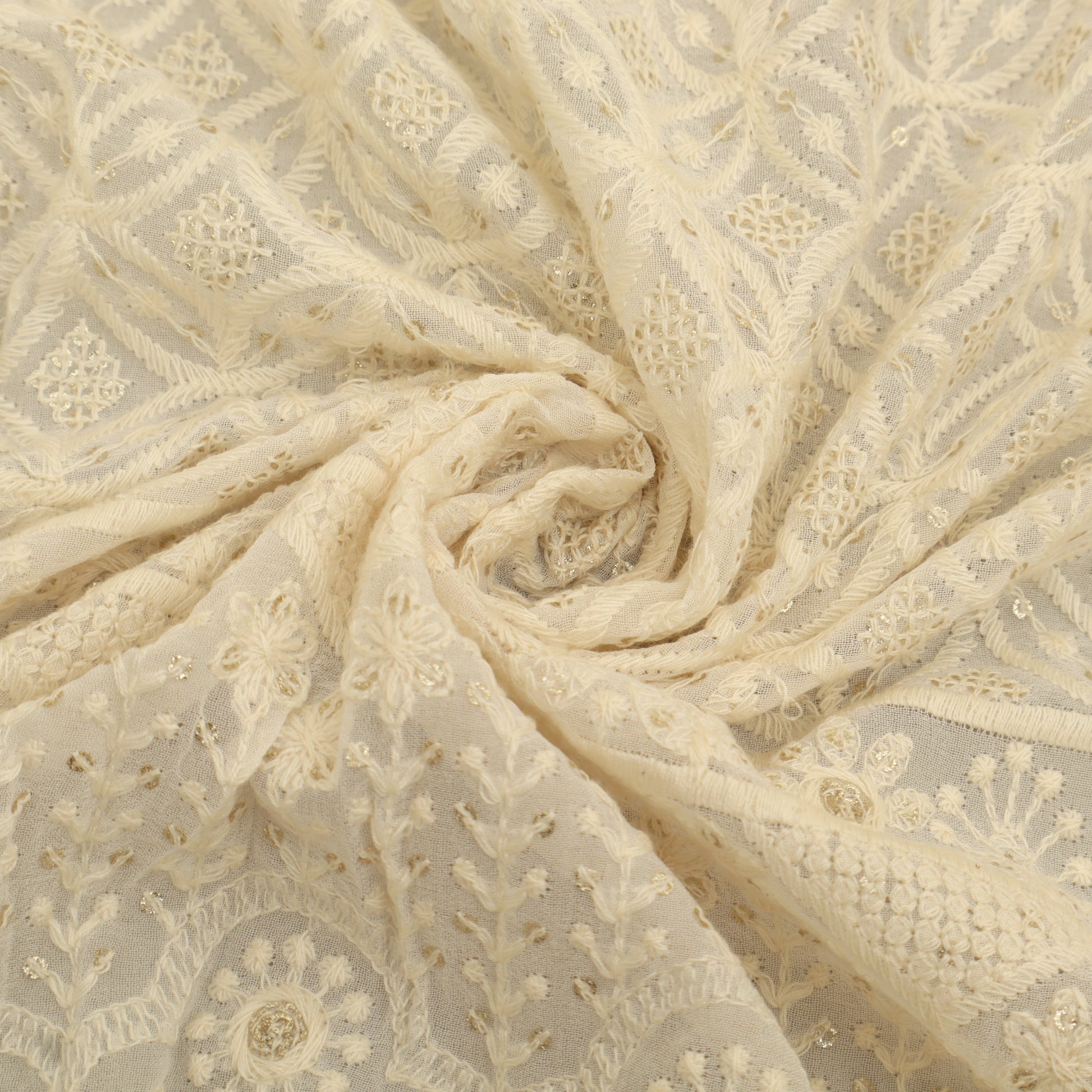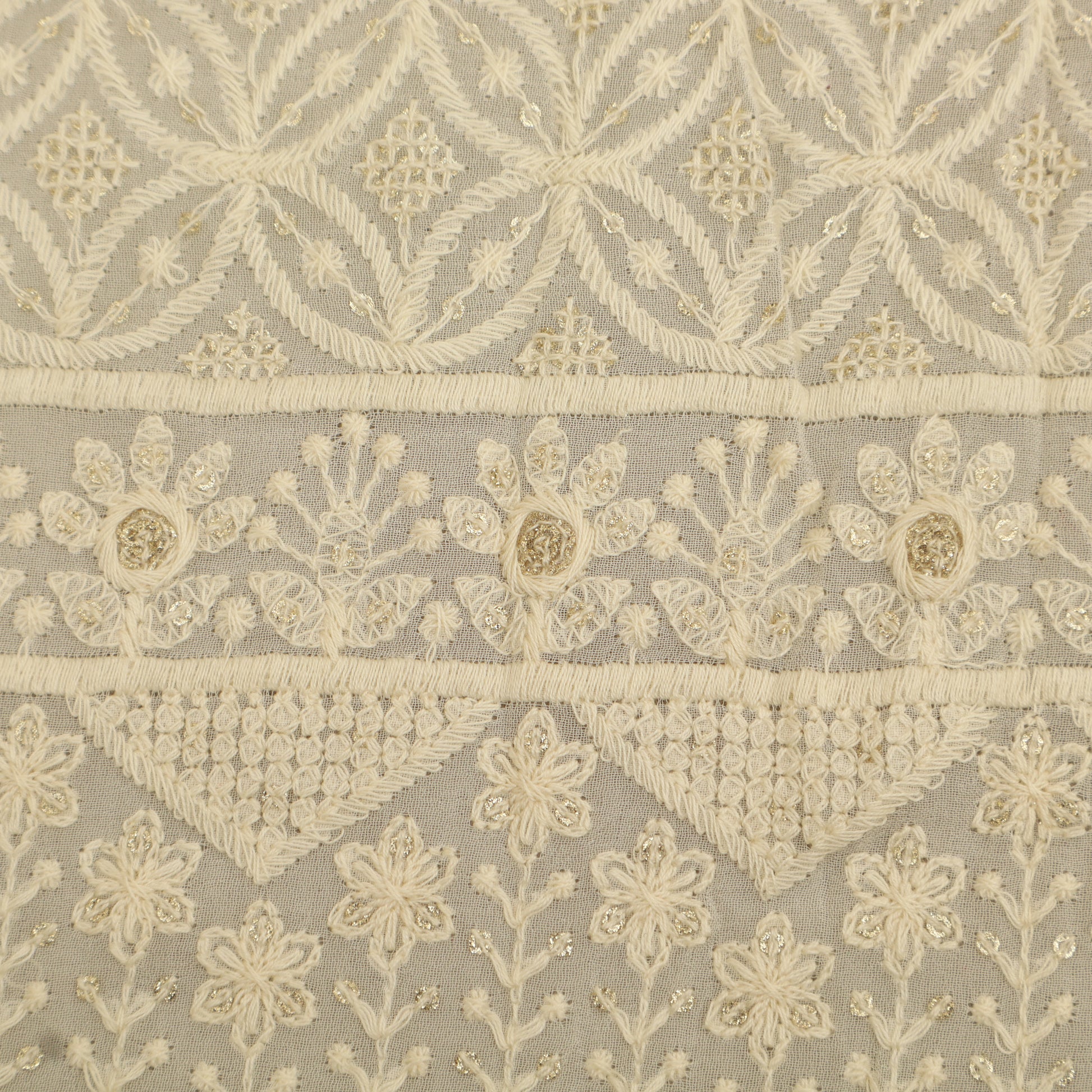 Expertly crafted from high-quality white georgette, this fabric is adorned with delicate embroidery, adding a touch of elegance to any project. Its lightweight and flowy texture make it perfect for creating beautiful drapes and flowing garments. Elevate your designs with this exquisite fabric.