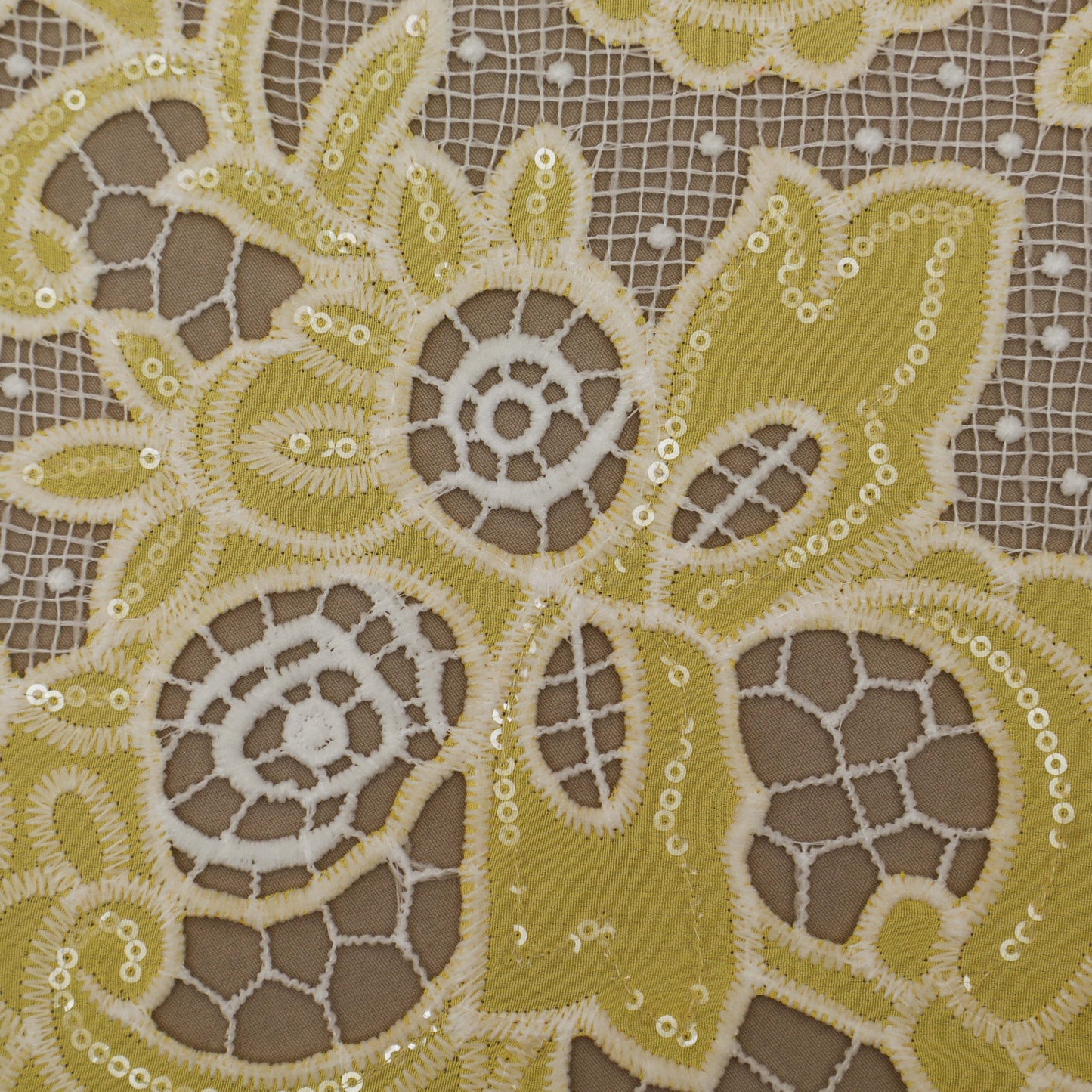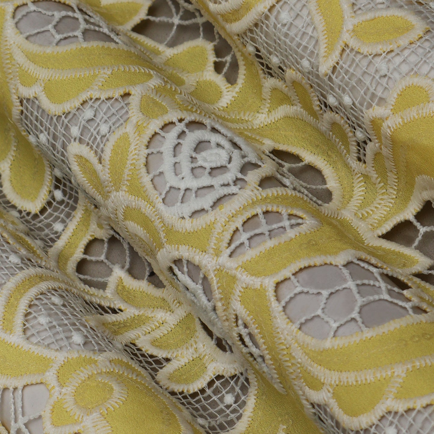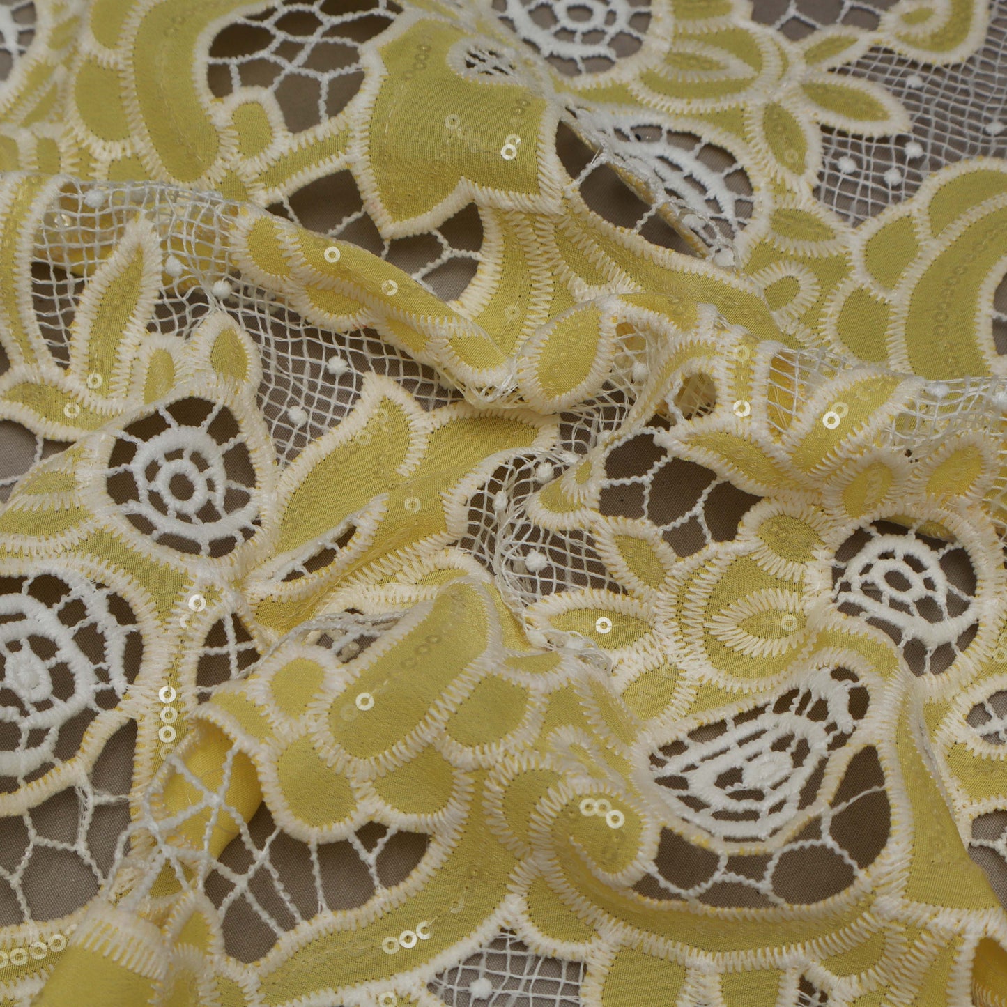 This lightweight Crepe Chikan Embroidery Fabric features a beautiful yellow color and intricate embroidery designs. Its soft texture and delicate details make it perfect for creating elegant and stylish garments. Made from high-quality materials, this fabric will add a touch of luxury to any creation.