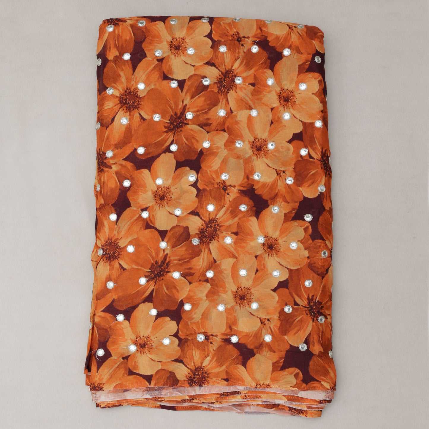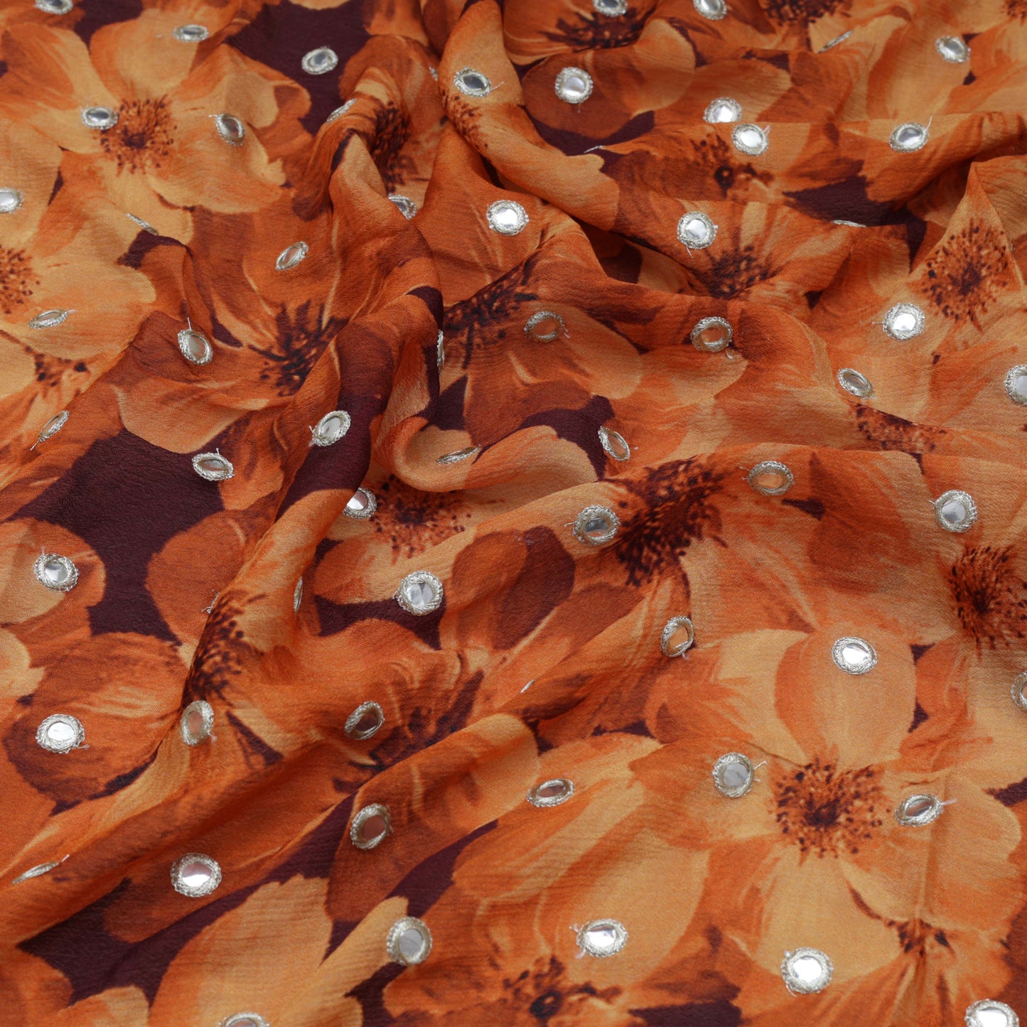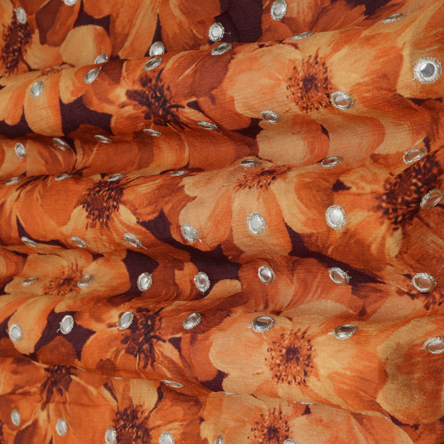 Chinnon chiffon is very flowy and comfortable for all types of trendy apparel like Suits, lehenga, crop top, blouse , Saree, designer dresses and more. Mirror work is also known as sheesha and abhala bharat embroidery. A style of embroidery known as "mirror-work" involves sewing tiny mirror or metal elements on fabric.
